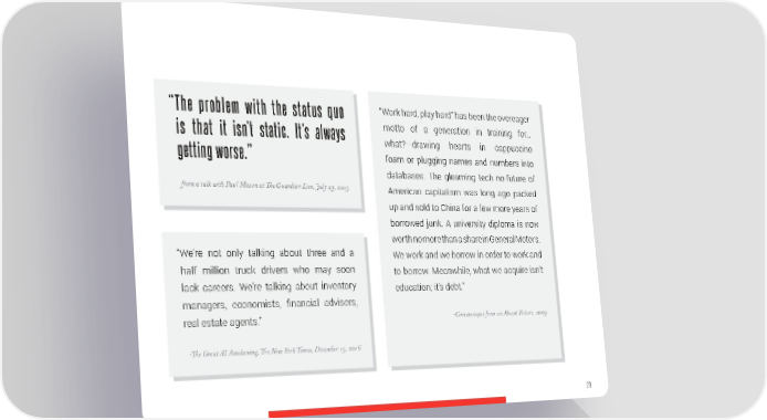 “ The problem with the status quo “ Work hard, play hard” has been the overeager is that it isn’t static. It’s always motto of a generation in training for… what?—drawing hearts in cappuccino getting worse.” foam or plugging names and numbers into databases. The gleaming tech no-future of -from a talk with Paul Mason at !e Guardian Live, July 23, 2015 American capitalism was long ago packed up and sold to China for a few more years of borrowed junk. A university diploma is now worth no more than a share in General Motors. “ We’re not only talking about three and a We work and we borrow in order to work and half million truck drivers who may soon to borrow. Meanwhile, what we acquire isn’t lack careers. We’re talking about inventory education; it’s debt.” managers, economists, financial advisers, real estate agents.” -Communiqué from an Absent Future, 2009 -!e Great AI Awakening, !e New York Times, December 15, 2016 29