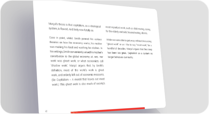 Marçal’s thesis is that capitalism, as a idealogical most important work, such as child-rearing, caring system, is flawed. And likely now fatally so. for the elderly and sick, housecleaning, chores. Case in point, whilst Smith penned his various While we were able to get away without discussing theories on how the economy works, his mother “ghost work” or as I like to say, “most work,” for a was making his food and washing his clothes. In handful of decades, Marçal argues that the creep his writings, Smith conveniently valued his mother’s has been too great. Capitalism as a system no contribution to the global economy at zero. Her longer behooves our reality. work was ghost work, or what economists call ‘shadow work.’ Marçal argues that, by Smith’s definition, most of the world’s work is ghost work, and entirely left out of economic measures. (So Capitalism = A model that leaves out most work.) This ghost work is also much of society’s 48