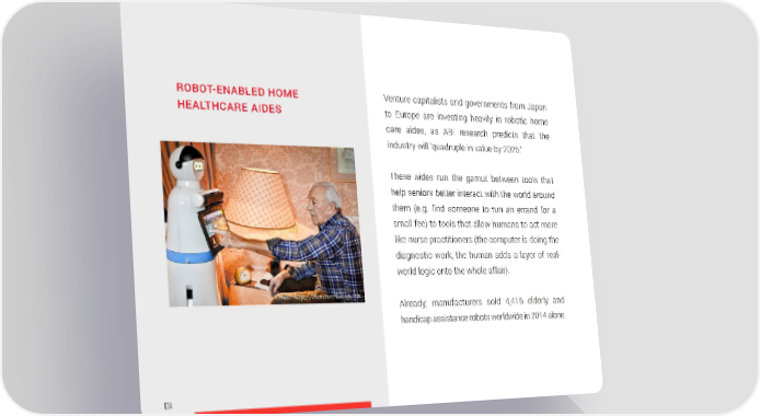 ROBOT-ENABLED HOME Venture capitalists and governments from Japan HEALTHCARE AIDES to Europe are investing heavily in robotic home care aides, as ABI research predicts that the industry will ‘quadruple in value by 2025.’ These aides run the gamut between tools that help seniors better interact with the world around them (e.g. find someone to run an errand for a small fee) to tools that allow humans to act more like nurse practitioners (the computer is doing the diagnostic work, the human adds a layer of real- world logic onto the whole affair). Credit: http://thenetwork.cisco.com Already, manufacturers sold 4,416 elderly and handicap assistance robots worldwide in 2014 alone. 134