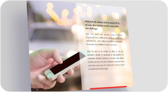 Aside from the obvious need to protect IP at all costs, these business models create other new challenges. Uber has made the specific point of being responsible for as little in the physical world as it possibly can—Uber’s drivers are left to assume the financial responsibility for their car leases. Sure it’s nice to be nimble as Uber is—it’s the business version of receiving all the benefits of marriage without having to actually care about another person—but that unlimited supply of zeros and ones can mean it’s extremely hard to create an entrenched advantage. 66