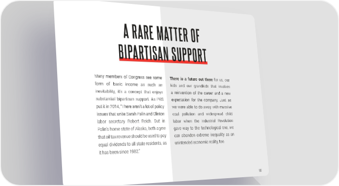 A RARE MATTER OF BIPARTISAN SUPPORT Many members of Congress see some There is a future out there for us, our form of basic income as such an kids and our grandkids that involves inevitability, it’s a concept that enjoys a reinvention of the career and a new substantial bipartisan support. As PBS expectation for the company. Just as put it in 2014, “There aren’t a lot of policy we were able to do away with massive issues that unite Sarah Palin and Clinton coal pollution and widespread child labor secretary Robert Reich. But in labor when the Industrial Revolution Palin’s home state of Alaska, both agree gave way to the technological one, we that oil tax revenue should be used to pay can abandon extreme inequality as an equal dividends to all state residents, as unintended economic reality, too. it has been since 1982.” 163