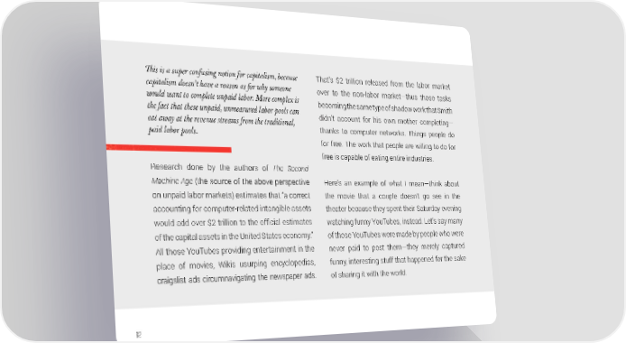 !is is a super confusing notion for capitalism, because That’s $2 trillion released from the labor market capitalism doesn’t have a reason as for why someone over to the non-labor market—thus those tasks would want to complete unpaid labor. More complex is becoming the same type of shadow work that Smith the fact that these unpaid, unmeasured labor pools can eat away at the revenue streams from the traditional, didn’t account for his own mother completing— paid labor pools. thanks to computer networks. Things people do for free. The work that people are willing to do for free is capable of eating entire industries. Research done by the authors of The Second Machine Age (the source of the above perspective Here’s an example of what I mean—think about on unpaid labor markets) estimates that “a correct the movie that a couple doesn’t go see in the accounting for computer-related intangible assets theater because they spent their Saturday evening would add over $2 trillion to the official estimates watching funny YouTubes, instead. Let’s say many of the capital assets in the United States economy.” of those YouTubes were made by people who were All those YouTubes providing entertainment in the never paid to post them—they merely captured place of movies, Wikis usurping encyclopedias, funny, interesting stuff that happened for the sake craigslist ads circumnavigating the newspaper ads. of sharing it with the world. 82