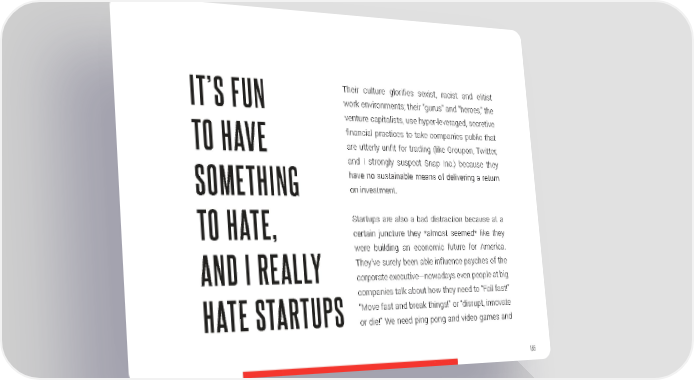 Their culture glorifies sexist, racist and elitist IT’S FUN work environments; their “gurus” and “heroes,” the venture capitalists, use hyper-leveraged, secretive financial practices to take companies public that TO HAVE are utterly unfit for trading (like Groupon, Twitter, and I strongly suspect Snap Inc.) because they have no sustainable means of delivering a return SOMETHING on investment. Startups are also a bad distraction because at a TO HATE, certain juncture they *almost seemed* like they were building an economic future for America. They’ve surely been able influence psyches of the AND I REALLY corporate executive—nowadays even people at big companies talk about how they need to “Fail fast!” “Move fast and break things!” or “disrupt, innovate HATE STARTUPS or die!” We need ping pong and video games and 155