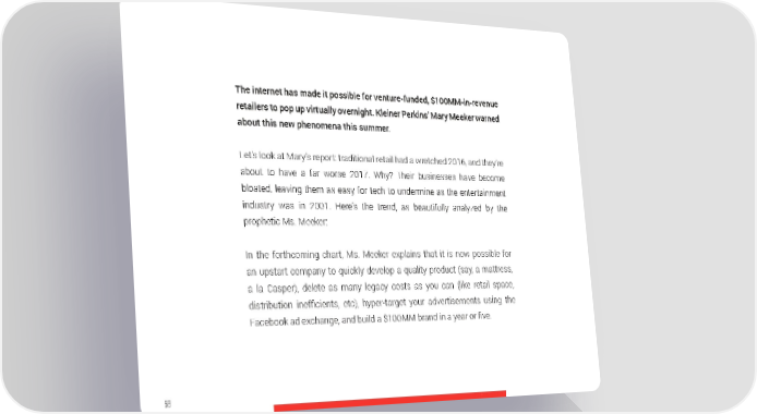 The internet has made it possible for venture-funded, $100MM-in-revenue retailers to pop up virtually overnight. Kleiner Perkins’ Mary Meeker warned about this new phenomena this summer. Let’s look at Mary’s report: traditional retail had a wretched 2016, and they’re about to have a far worse 2017. Why? Their businesses have become bloated, leaving them as easy for tech to undermine as the entertainment industry was in 2001. Here’s the trend, as beautifully analyzed by the prophetic Ms. Meeker: In the forthcoming chart, Ms. Meeker explains that it is now possible for an upstart company to quickly develop a quality product (say, a mattress, a la Casper), delete as many legacy costs as you can (like retail space, distribution inefficients, etc), hyper-target your advertisements using the Facebook ad exchange, and build a $100MM brand in a year or five. 56