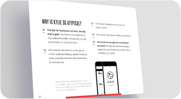 WHY IS KYLIE SO ATYPICAL? 03 She forgoes longterm store leases for pop-up leases 01 One day her businesses are here, one day they’re gone. She feels no commitment to 04 She spends nothing on traditional marketing any particular timeline or longevity. It’s just 05 She all but encourages the secondhand opportunities as she finds them economy that pops up around her goods— 02 She produces limited runs of her goods, some kids stand in line to buy them only to which, aside from being a good marketing resell them at a profit tactic, insulates her from the financial risk of overstocking Apps like Goat take advantage of these resell communities, creating youth-friendly, hyper-specific versions for certain kinds of goods (Goat is the tool of choice for sneakerheads). 128