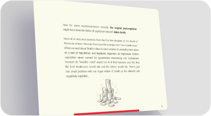 Now for some macroeconomics comedy—the original post-capitalist might have been the father of capitalism himself: Adam Smith. Most of us only read excerpts from the first few chapters of The Wealth of Nations in school—the ones that cover the concepts like “The Invisible Hand.” When we read about Smith’s ideas in news articles it’s probably most often as a sort of Republican, anti-regulation argument, an implication Smith’s capitalism never wanted for government monitoring and involvement because its “Invisible Hand” would see to it that business was fair, that the best businesses would win and the others would fail. There’s just one small problem with our vague notion of Smith as the ultimate anti- regulatory capitalist… 45