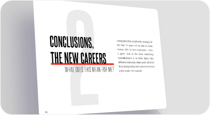 Companies that weather the changes of CONCLUSIONS, the next 10 years will be able to make money with far less employees. That’s a given. One of the more interesting considerations is to think about how THE NEW CAREERS different industries might profit off of all WHAT DOES THIS MEAN FOR ME? those burgeoning mini-careers to be had in the world. For example: 144