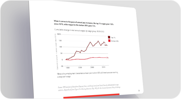 When it comes to the pace of annual pay increases, the top 1% wages grew 138% since 1979, while wages for the bottom 90% grew 15%. Cumulative change in real annual wages, by wage group, 1979-2013 200% Top 1% 150 Bottom 90% ge since 1979 138% 100 50 owth in annual wa 15% e gr 0 -50 1980 1990 2000 2010 Cumulativ Measuring employment becomes a moot point when 90% of Americans are earning a stagnant wage. Source: EPI analysis of data from Kopczuk, Saez, and Song (2010) and Social Security Administration wage statistics. Reproduced from Figure F in Raising America’s Pay: %y It’s Our Central Economic Policy Challenge. 23