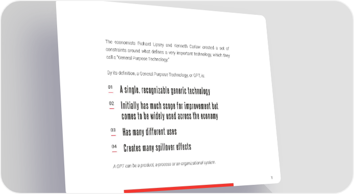 The economists Richard Lipsey and Kenneth Carlaw created a set of constraints around what defines a very important technology, which they call a “General Purpose Technology.” By its definition, a General Purpose Technology, or GPT, is: 01 A single, recognizable generic technology 02 Initially has much scope for improvement but comes to be widely used across the economy 03 Has many different uses 04 Creates many spillover effects A GPT can be a product, a process or an organizational system. 71