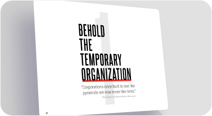 Future of Work, Think Series Page 103 Page 105BEHOLD THE TEMPORARY ORGANIZATION “ Corporations once built to last like pyramids are now more like tents.” -Peter Drucker to the Harvard Business Review, 1992 110