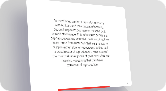 As mentioned earlier, a capitalist economy was built around the concept of scarcity, but post-capitalist companies must be built around abundance. This is because goods in a capitalist economy were rival, meaning that they were made from materials that were limited in supply (either labor or resource) and thus had a certain cost of reproduction. Now many of the most valuable goods of post-capitalism are non-rival—meaning that they have zero cost of reproduction. 61