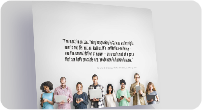 “ The most important thing happening in Silicon Valley right now is not disruption. Rather, it’s institution-building — and the consolidation of power — on a scale and at a pace that are both probably unprecedented in human history.” -“!e Great AI Awakening,” !e New York Times, December 15, 2016 92
