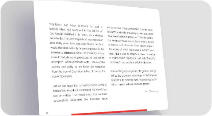 “Capitalism had been dominant for over a which we have only just embarked. It would be as century when Karl Marx in the first volume of foolish to predict the knowledge society as it would Das Kapital identified it (in 1867), as a distinct have been foolish to predict in 1776—the year of social order. The term “Capitalism” was not coined the American Revolution, of Adam Smith’s Wealth until thirty years later, well after Marx’s death. It of Nations, and of James Watt’s steam engine— would therefore not only be presumptuous in the the society of which Marx wrote a hundred years extreme to attempt to write The Knowledge today; later. And it was as foolish of Marx to predict it would be ludicrously premature. All that can be in mid-Victorian Capitalism—and with “Scientific attempted—all this book attempts—is to describe infallibility”—the society in which we live now. society and polity as we begin the transition from the Age of Capitalism (also, of course, the But one thing we can predict: the greatest change Age of Socialism). will be the change in knowledge—in its form and content; in its meaning; in its responsibility; and in But we can hope that a hundred years hence a what it means to be an educated person.” book of this kind, if not one entitled The Knowledge, can be written. That would mean that we have -Peter F. Drucker, 1993 successfully weathered the transition upon 164