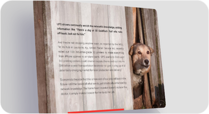 UPS drivers continually enrich the network’s knowledge, adding information like “There’s a dog at 55 Goldfinch Trail who runs off-leash, look out for him.” And they’re not stopping anytime soon, as reported by the WSJ, “At its hub in Louisville, Ky., United Parcel Service Inc. recently rolled out 100 industrial-grade 3D printers to make everything from iPhone gizmos to air-plane parts. UPS wants to find out if 3-D printing centers could shorten supply chains and cut into its $58 billion-a-year transportation business—or give it a leg up in a potentially emerging market for local production and delivery.” Economists theorize that this is how a lot of our jobs will look in the future—still the basics of what we do, just drastically enhanced by network knowledge. The home heart monitor doesn’t replace the doctor, it simply makes it easier for her to do her job. 137