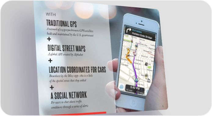 WITH TRADITIONAL GPS A network of 24 geosynchronous GPS satellites built and maintained by the U.S. government DIGITAL STREET MAPS A global API created by Alphabet LOCATION COORDINATES FOR CARS Broadcast by the Waze app—this is a little of the special sauce that they added A SOCIAL NETWORK For users to chat about traffic conditions through a series of alerts 75