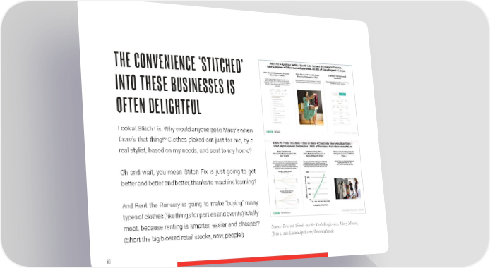 THE CONVENIENCE ‘STITCHED’ INTO THESE BUSINESSES IS OFTEN DELIGHTFUL Look at Stitch Fix. Why would anyone go to Macy’s when there’s that thing!? Clothes picked out just for me, by a real stylist, based on my needs, and sent to my home? Oh and wait, you mean Stitch Fix is just going to get better and better and better, thanks to machine learning? And Rent the Runway is going to make ‘buying’ many types of clothes (like things for parties and events) totally moot, because renting is smarter, easier and cheaper? Source: Internet Trends 2016 – Code Conference, Mary Meeker, (Short the big bloated retail stocks, now, people!) June 1, 2016, www.kpcb.com/InternetTrends 58