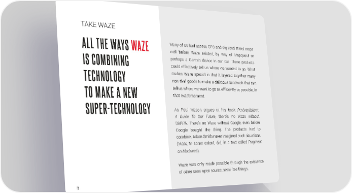 TAKE WAZE ALL THE WAYS WAZE Many of us had access GPS and digitized street maps well before Waze existed, by way of Mapquest or IS COMBINING perhaps a Garmin device in our car. These products could effectively tell us where we wanted to go. What makes Waze special is that it layered together many TECHNOLOGY non-rival goods to make a delicious sandwich that can tell us where we want to go as efficiently as possible, in TO MAKE A NEW that exact moment. SUPER-TECHNOLOGY As Paul Mason argues in his book Postcapitalism: A Guide To Our Future, there’s no Waze without DARPA. There’s no Waze without Google, even before Google bought the thing. The products had to combine. Adam Smith never imagined such situations. (Marx, to some extent, did, in a text called Fragment on Machines). Waze was only made possible through the existence of other semi-open source, semi-free things. 74
