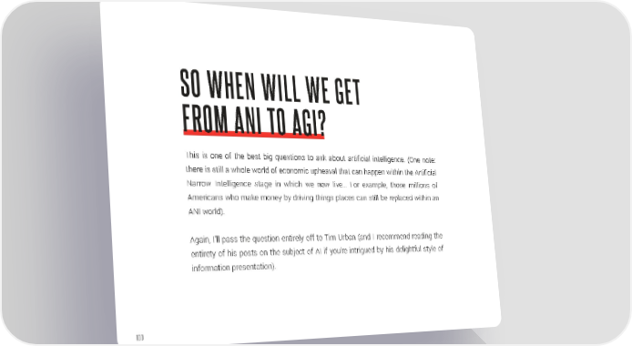 SO WHEN WILL WE GET FROM ANI TO AGI? This is one of the best big questions to ask about artificial intelligence. (One note: there is still a whole world of economic upheaval that can happen within the Artificial Narrow Intelligence stage in which we now live… For example, those millions of Americans who make money by driving things places can still be replaced within an ANI world). Again, I’ll pass the question entirely off to Tim Urban (and I recommend reading the entirety of his posts on the subject of AI if you’re intrigued by his delightful style of information presentation). 100