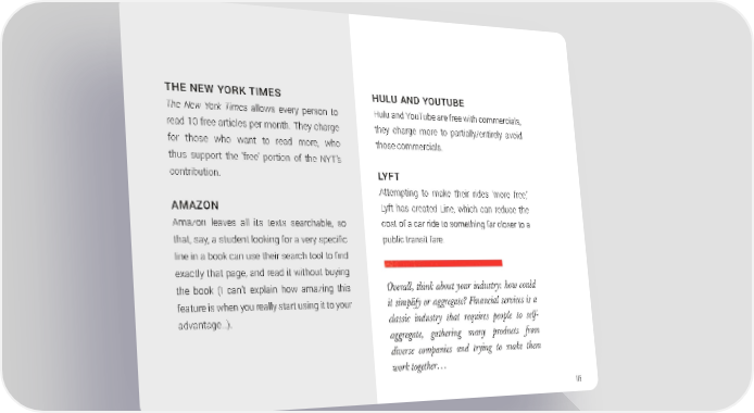 THE NEW YORK TIMES HULU AND YOUTUBE The New York Times allows every person to Hulu and YouTube are free with commercials, read 10 free articles per month. They charge they charge more to partially/entirely avoid for those who want to read more, who those commercials. thus support the ‘free’ portion of the NYT’s contribution. LYFT Attempting to make their rides ‘more free,’ AMAZON Lyft has created Line, which can reduce the Amazon leaves all its texts searchable, so cost of a car ride to something far closer to a that, say, a student looking for a very specific public transit fare. line in a book can use their search tool to find exactly that page, and read it without buying the book (I can’t explain how amazing this Overall, think about your industry: how could feature is when you really start using it to your it simplify or aggregate? Financial services is a advantage…). classic industry that requires people to self- aggregate, gathering many products from diverse companies and trying to make them work together… 115