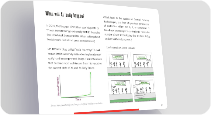 When will AI really happen? (Think back to the section on General Purpose Technologies, and how all previous generations of civilization either had 0, 1, or sometimes 2 In 2015, the blogger Tim Urban saw his posts on brand-new technologies to contend with—verses the “The AI Revolution” go extremely viral (to the point number of new technologies that we have today, that Elon Musk then asked Mr. Urban to blog about and we will have tomorrow…) Tesla’s work. Talk about good compliments!) Equally good are these 4 charts: Mr. Urban’s blog, called “Wait But Why?” is well- known for its extremely researched explanations of really hard to comprehend things. Here’s the chart that became most well-known from his report on the current state of AI, and its likely future: Source: http://waitbutwhy.com/2015/01/artificial-intelligence-revolution-1 97