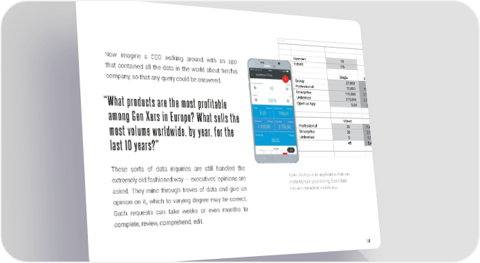 Lizenzen 10 Now imagine a CEO walking around with an app Rabatt 0% that contained all the data in the world about her/his Single Sux company, so that any query could be answered. Group 27,000 Professional 70,000 7000 Enterprise 135,000 1.3500 Unlimited 270,000 2.7000 “ What products are the most profitable Open as App 5,00 50 among Gen Xers in Europe? What sells the Mixed Professional 20 1.4000 most volume worldwide, by year, for the Enterprise 20 2.7000 Unlimited 5 1.3500 last 10 years?” 45 5.4500 These sorts of data inquiries are still handled the Open As App is an application that can extremely old fashioned way — executives’ opinions are instantly turn your boring Excel data asked. They mine through troves of data and give an into an interactive mobile app. opinion on it, which to varying degree may be correct. Such requests can take weeks or even months to complete, review, comprehend, edit. 141