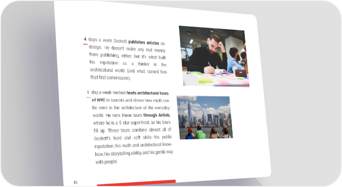 4 days a week Beckett publishes articles on design. He doesn’t make any real money from publishing, either, but it’s what built his reputation as a thinker in the architectural world (and what earned him that first commission). 1 day a week Beckett hosts architectural tours of NYC to tourists and shows how math can be seen in the architecture of the everyday world. He runs these tours through Airbnb, where he is a 5 star super-host, so his tours fill up. These tours combine almost all of Beckett’s hard and soft skills—his public reputation, his math and architectural know- how, his storytelling ability, and his gentle way with people. 124