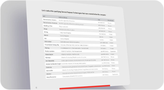 Let’s look at the qualifying General Purpose Technologies that man created before the computer: GPT Spillover Effects Date Classification Domestication of plants Neolithic Agricultural Revolution 9000-8000 BC Process Domestication of animals Neolithic Agricultural Revolution, Working Animals 8500-7500 BC Process Smelting of Ore Early metal tools 8000-7000 BC Process Wheel Mechanization, Potter’s wheel 4000-3000 BC Product Writing Trade, Record keeping 3400-3200 BC Process Bronze Tools & Weapons 2800 BC Product Iron Tools & Weapons 1200 BC Product Water wheel Inanimate power, Mechanical systems Early Middle Ages Product Three-Masted Sailing Ship Discovery of the New World, Maritime Trade, Colonialism 15th Century Product Printing Knowledge economy, Science education, Financial credit 16th Century Process Factory systems Industrial Revolution, Interchangeable arts Late 18th Century Organization Steam Engine Industrial Revolution, Machine Tools Late 18th Century Product Railways Suburbs, Commuting, Flexible location of factories Mid 19th Century Product Iron Steamship Global agricultural trade, International tourism, Dreadnought Battleship Mid 19th Century Product Internal Combustion Engine Automobile, Airplane, Oil Industry, Mobile warfare Late 19th Century Product Electricity Centralized power generation, Factory electrification, Telegraphic communication Late 19th Century Product Automobile Suburbs, Commuting, Shopping Centers, Long-distance domestic tourism 20th Century Product Airplane International tourism, International sport leagues, Mobile warfare 20th Century Product Mass Production Consumerism, Growth of U.S. economy 20th Century Organization 72