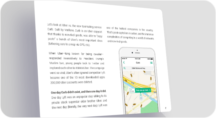 Let’s look at Uber vs. the new taxi-hailing service one of the hottest companies in the country. Curb. Built by Verifone, Curb is an Uber copycat That’s post-capitalism in action, and the immense that thanks to non-rival goods, was able to “copy complexities of competing in a world of networks paste” a bunch of Uber’s most important ideas and non-rival goods. (tethering cars to a map via GPS, etc). When Uber—long known for being cavalier— responded insensitively to President Trump’s Muslim ban, young people took to Twitter and implored each other to #deleteUber. The campaign went so viral, Uber’s often-ignored competitor Lyft became one of the 10 most downloaded apps. 200,000 Uber accounts were deleted. One day Curb didn’t exist, and then one day it did. One day Lyft was an unpopular step sibling to its private stock superstar older brother Uber, and the next day (literally, the very next day) Lyft was 67