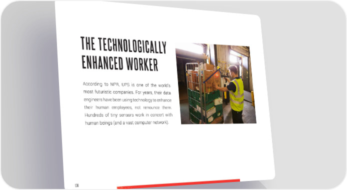 THE TECHNOLOGICALLY ENHANCED WORKER According to NPR, UPS is one of the world’s most futuristic companies. For years, their data engineers have been using technology to enhance their human employees, not renounce them. Hundreds of tiny sensors work in concert with human beings (and a vast computer network). 136