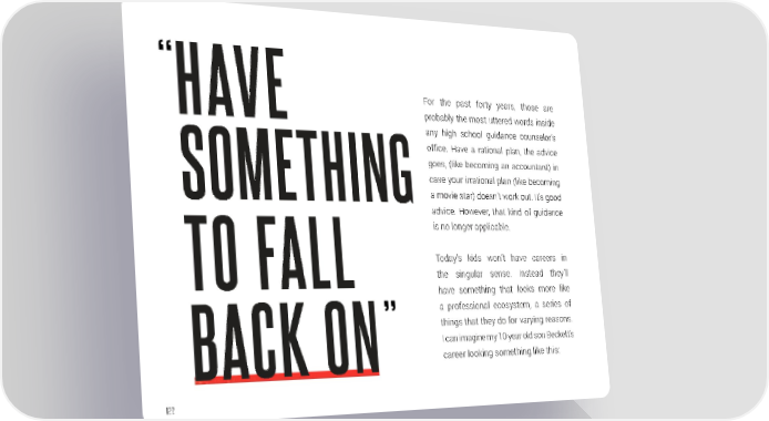 “ For the past forty years, those are HAVE probably the most uttered words inside any high school guidance counselor’s office. Have a rational plan, the advice goes, (like becoming an accountant) in case your irrational plan (like becoming SOMETHING a movie star) doesn’t work out. It’s good advice. However, that kind of guidance is no longer applicable. Today’s kids won’t have careers in TO FALL the singular sense. Instead they’ll have something that looks more like a professional ecosystem, a series of things that they do for varying reasons. ” I can imagine my 10 year old son Beckett’s BACK ON career looking something like this: 122