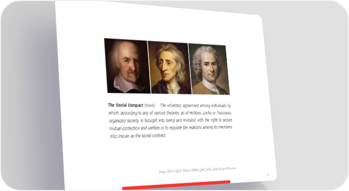 The Social Compact (noun) – The voluntary agreement among individuals by which, according to any of various theories, as of Hobbes, Locke, or Rousseau, organized society is brought into being and invested with the right to secure mutual protection and welfare or to regulate the relations among its members. Also known as the social contract. Images (left to right): !omas Hobbes, John Locke, Jean-Jacques Rousseau. 7