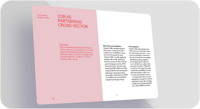 Case Studies CSR AS Organic Valley PARTNERING CROSS-SECTOR Their core: How their core manifests: Why it matters: When you spend your milk money on Organic Organic Valley, headquartered in Organic Valley demonstrates that Valley, we give you fresh food you can trust. It all Wisconsin, is made up of 2,000 CSR can’t be executed solely within comes from the family farms of our cooperative. family farms. In addition to being the walls of the corporation — cross- With your support, we make real changes in the advocates of organic farming, sector partnerships are needed (in (51) world one small step—and farm—at a time. — Organic Valley recently made real this case, through their partnership Organic Valley website change in the world—starting in with the local energy company). their own backyard. The brand set Everything Organic Valley does a goal of being powered by 100% starts with the farm and naturally renewable energy, and when they permeates from there. Their effort met that goal they didn’t stop. They to reach out and support the larger worked with the local communities community around them was not and energy companies to share done out of charity, rather it was the benefits which allowed 23,000 born directly from their mission rural Midwestern households to — starting with family farms and benefit from cheaper energy.(52) expanding to change the world one small step at a time. By leveraging a public-private partnership, they were able to fulfill this mission. 76 77