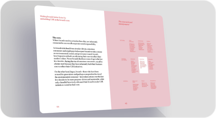 Making brands better faster by The corporate brand embedding CSR in the brand’s core identity matrix(30) The core: EXTERNAL Value Relationships Positions proposition Where brands need to articulate how they are inherently What should be What is our What are our the nature of our intended connected to an overall corporate social responsibility key offerings, relationships position in the and how do with key market and we want them customers in the hearts to appeal to and other and minds of customers stakeholders? key customers As brands take heed from circular-driven, conscious and other and other consumers and employees (who expect brands to take a stance stakeholders? stakeholders? on environmental, social, and governance issues), brands have begun to embark on reframing their core to reflect their modern values. Newer brands that have come of age in the last INTERNAL Expression Brand Core Personality /EXTERNAL few decades, during the rise of conscious consumers, are off to What is What do we What distinctive promise and combination about the what are the of human a faster start because they have inherently built their business way we core values that characteristics communicate sum up what our or qualities core to reflect their CSR initiatives. and express brand stands forms our ourselves for? corporate and makes it character? possible to On the other hand, legacy brands—those who have been recognize us at a distance? around for generations and perhaps even predate the rise of the environmental consumer—have taken actions over the last few decades to be more purpose-driven and sustainable, while only a handful have truly reframed their brand to make CSR INTERNAL Mission and Culture Competences Vision initiatives rooted in their core. What are our What are we What engages attitudes, and particularly us (mission)? how do we work good at, and What is our and behave? what makes us direction and better than the inspiration competition? (vision)? 44 45