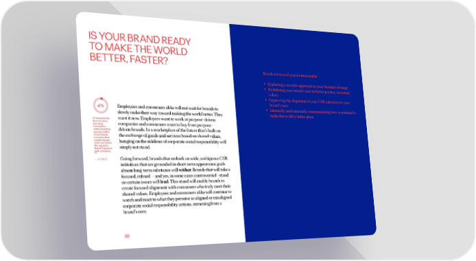 IS YOUR BRAND READY TO MAKE THE WORLD BETTER, FASTER? Reach out to us if you’re interested in: • Exploring a circular approach to your business strategy • Redefining your brand’s core to better portray conscious values • Improving the alignment of your CSR initiatives to your brand’s core 6% Employees and consumers alike will not wait for brands to • Internally and externally communicating how you intend to 6+94M slowly make their way toward making the world better. They make the world a better place of respondents want it now. Employees want to work at purpose-driven from medium and large companies and consumers want to buy from purpose- companies stated that they driven brands. In a marketplace of the future that’s built on operate within a sustainable the exchange of goods and services based on shared values, company that creates shared hanging on the sidelines of corporate social responsibility will value and where the organiza- simply not stand. tional Purpose is well-activated. (60) ―EY 2017 Going forward, brands that embark on wide, ambiguous CSR initiatives that are grounded in short-term appearance goals absent long-term substance will wither. Brands that will take a focused, refined — and yes, in some cases controversial—stand on certain issues will lead. This stand will enable brands to create focused alignment with consumers who truly meet their shared values. Employees and consumers alike will continue to watch and react to what they perceive as aligned or misaligned corporate social responsibility actions, stemming from a brand’s core. 88