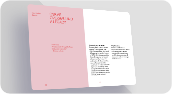 Case Studies CSR AS Danone OVERHAULING A LEGACY Their core: How their core manifests: Why it matters: Bringing health through food to as Danone’s North America business Danone is a multinational (44) many people as possible. received B-corp status in 2017. conglomerate that has been around ―Danone website CEO Emmanuel Faber aims for all since the early 1900s. Its pivot of Danone to be a certified B-corp to sustainability across its entire by 2030(45). It’s building a healthier portfolio demonstrates how all future through food not in overt brands, new and veteran, can put all-encompassing ways, but by CSR at their core. studying how food and nutrition can best be improved in 52 countries in the world, and adapts its products accordingly. In one example, Danone recently added vitamins to one of its best-selling cheeses after researching the diets of young people in Brazil.(46) 66 67