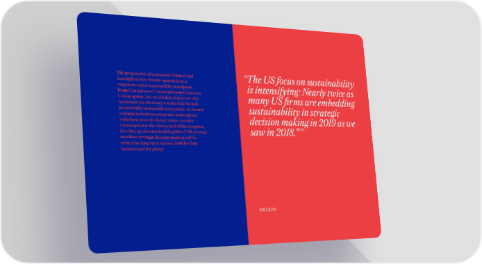 “The US focus on sustainability is intensifying: Nearly twice as many US firms are embedding sustainability in strategic deci- sion making in 2019 as we saw (30) in 2018. ” ―ING 2019 The progression of consumers’ interest and “The US focus on sustainability oversight in how brands operate from a corporate social responsibility standpoint, is intensifying: Nearly twice as from Conspicuous Consumption to Conscious Consumption, has an absolute impact on why many US firms are embedding businesses are choosing to make their brands purposefully sustainable ecosystems. As brands sustainability in strategic continue to listen to consumers and migrate with them toward a future where circular decision making in 2019 as we consumption is the rule instead of the exception, (28) how they go about embedding their CSR strategy saw in 2018.” into their strategic decision making will be critical for long-term success, both for their business and the planet. ―ING 2019