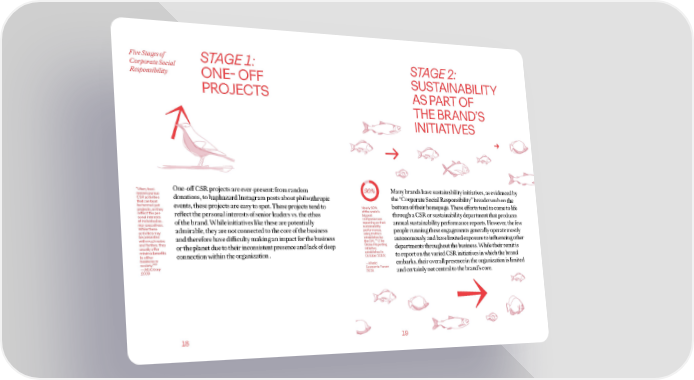 Five Stages of STAGE 1: STAGE 2: Corporate Social Responsibility ONE- OFF SUSTAINABILITY PROJECTS AS PART OF THE BRAND’S INITIATIVES "Many busi- One-off CSR projects are ever-present: from random 90% Many brands have sustainability initiatives, as evidenced by nesses pursue CSR activities donations, to haphazard Instagram posts about philanthropic 90+10M the “Corporate Social Responsibility” breadcrumb on the that can best be termed pet events, these projects are easy to spot. These projects tend to Nearly 90% bottom of their homepage. These efforts tend to come to life projects, as they of the world’s reflect the per- reflect the personal interests of senior leaders vs. the ethos biggest through a CSR or sustainability department that produces sonal interests companies are of individual se- of the brand. While initiatives like these are potentially reporting on their annual sustainability performance reports. However, the few nior executives. sustainability While these admirable, they are not connected to the core of the business performance, people running these engagements generally operate mostly activities may using metrics be presented established by with much noise and therefore have difficulty making an impact for the business the GRI.(10) (The autonomously and have limited exposure to influencing other and fanfare, they Global Reporting usually offer or the planet due to their inconsistent presence and lack of deep Initiative, departments throughout the business. While their remit is minimal benefits established in to either connection within the organization . October 2016) to report on the varied CSR initiatives in which the brand business or society."(09) ―World embarks, their overall presence in the organization is limited ―McKinsey Economic Forum 2009 2019. and certainly not central to the brand’s core. 18 19