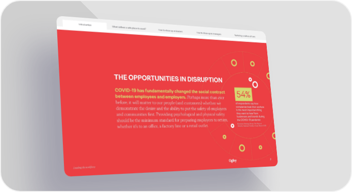 What defines a safe place to work? How to show up as leaders How to show up as managers Nurturing a culture of care Introduction What defines a safe place to work? How to show up as leaders How to show up as managers Nurturing a culture of care THE OPPORTUNITIES IN DISRUPTION COVID-19 has fundamentally changed the social contract 54% between employees and employers. Perhaps more than ever before, it will matter to our people (and customers) whether we of respondents say how demonstrate the desire and the ability to put the safety of employees companies treat their workers is the most important thing and communities first. Providing psychological and physical safety they want to hear from businesses and brands during should be the minimum standard for preparing employees to return, the COVID-19 pandemic whether it’s to an office, a factory line or a retail outlet. Benenson Strategy Group, The Pulse of America: National Omnibus Study, March 2020. Leading the workforce 2
