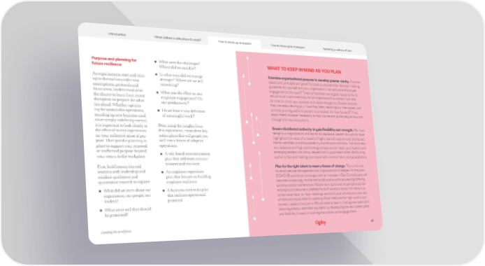Introduction What defines a safe place to work? How to show up as managers Nurturing a culture of care Introduction What defines a safe place to work? How to show up as leaders How to show up as managers Nurturing a culture of care Purpose and planning for ▪ What were the challenges? WHAT TO KEEP IN MIND AS YOU PLAN future resilience Where did we stumble? ▪ In what ways did we emerge Examine organisational purpose to develop greater clarity. Purpose, As organisations reset and reim- stronger? Where are we still values and principles are powerful tools to provide clear decision-making agine themselves under new recovering? guidelines for yourself and your organisation. Had lacklustre employee assumptions, protocols and engagement in the past? Times of transition are a great opportunity to focus areas, leaders must seize ▪ What was the effect on our rebuild trust in and credibility for an organisation’s purpose. It can also the chance to learn from recent employee engagement? On be time to revisit your purpose and values altogether. Decide whether disruption to prepare for what our productivity? they are really serving you. Have they been meaningfully internalised, and lies ahead. Whether optimis- are they proving useful to people to articulate the way forward? If not, ing for sustainable operations, ▪ Do we have a new definition adapt them however necessary to help inspire and guide people now and standing up new business mod- of meaningful work? through the next disruptions. els or simply redefining normal, it is important to look closely at Next, using the insights from Ensure distributed authority to gain flexibility and strength. We must the effect of recent experiences this exploration, create three key design our organisations and teams for resilience. Recent disruptions have on your collective sense of pur- action plans that will propel you highlighted the value of a model of highly trained, experienced, distributed pose. Then put the planning in well into a future of adaptive teams—enabled and empowered by coordination and data. The most resil- place to support your renewed operations. ient, adaptive and high-performing companies are made up of leaders and or reaffirmed purpose beyond ▪ A role-based communications emerging leaders who know, respect and support each other, distributing your return to the workplace. plan that addresses commu- authority fast and making sure responsible owners have strong capabilities. First, hold lessons learned nicators and receivers Plan for the right talent to meet a future of change. This is the time sessions with leadership and ▪ An employee experience to revisit people management and organisational strategies. As the post- conduct qualitative and plan that focuses on building COVID-19 workforce converges with an increase in Gen Z, employees will quantitative research to explore: employee resilience become increasingly mobile and collaborative while expressing differing ▪ What did we learn about our ▪ A business continuity plan communication preferences. Mobile work tools and virtual reality confer- organisation, our people, our that outlines operational encing could become a prefered form of communication for many cus- leaders? protocols tomers over face-to-face meetings, and the future will require a new set of skills and capabilities for wielding those mediums for high-quality out- ▪ What went well that should comes. Leaders (not just in HR) will need to lean in, finding new talent and be protected? retaining already-identified top talent by developing the new career paths and flexibility in ways of working that attract and engage them. Leading the workforce 10