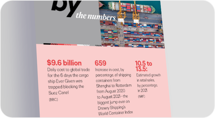 by the numbers $9.6 billion 659 10.5 to Daily cost to global trade Increase in cost, by 13.5: for the 6 days the cargo percentage, of shipping Estimated growth ship Ever Given was containers from in retail sales, trapped blocking the Shanghai to Rotterdam by percentage, Suez Canal from August 2020 in 2021 (BBC) to August 2021—the (NRF) biggest jump ever on Drewry Shipping’s World Container Index (CNN) 10 BUSINESS & GROWTH TRENDS 2022 OGILVY GROWTH & INNOVATION