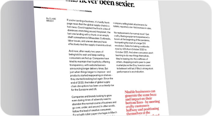 Trend In 2022, reliability has never been sexier. By CLARE If you’re running a business, it’s hardly front- company selling bidet attachments for BRODY page news that the global supply chain is a toilets, reported a ten-fold increase in sales. hot mess. Covid toppled the first in a line of dominoes stretching around the planet, the No replacements for normal stock? Get last one landing with a thunk on an empty crafty. Baking equipment experienced a shelf somewhere in Milwaukee. Outbreaks, boom at the beginning of the pandemic, labor issues, and uneven demand have trumpeting the start of a larger DIY effectively tied the supply chain into a knot. revolution. Sales for baking cookbooks rose by 42% from October 2020 to And now, after nearly two years of October 2021. And when consumers aren’t being told to wait and keep waiting, learning to do new things themselves, consumers are fed up. Companies have they’re leaning into the craftiness of tried to maintain their loyalty by offering others, shopping small in peer-to-peer transparency, with website banners marketplaces like Etsy. Investors seem announcing longer delivery times. But to believe it will last, if Etsy’s strong stock just when things began to improve—and performance is any indication. products started reappearing on shelves— they started breaking bad again. Since the end of 2020, the index of global supply chain disruptions has been on a steady rise for the Eurozone and US. 2Companies and brands looking to grow Nimble businesses can even during times of adversity need to generate the same buzz abandon the normal course of business and and impact on their go over, under, and around. In other words, bottom lines—by meeting follow the lead of creative consumers. crafty customers Faced with toilet-paper shortages in March halfway and positioning 2020, Americans turned to an unlikely (at themselves at the least for Americans) solution: the bidet. intersection of need and At the peak of the shortage, TUSHY, a supply. 9 BUSINESS & GROWTH TRENDS 2022 OGILVY GROWTH & INNOVATION