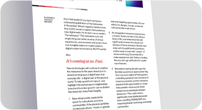 Teeming with cryptocurrency, NFTs, avatars, and entire Trend immersive worlds, the metaverse is both misunderstood and overhyped. Here’s what you need to know. By MARINA Don’t feel bashful if you don’t yet have a narrower targeting opportunities. (It’s not LINDSAY- solid working definition of the metaverse. without its dangers, though, as internet BROWN subcultures like incels show.) In November, Wired magazine needed more than 2,000 words to explain the borderless 2. An unregulated metaverse poses privacy new digital realm for its tech-savvy readers. concerns. If personal data is the exhaust The takeaway? The metaverse is no one fume of life, your metaversal twin will single thing, but rather an array of virtual significantly increase the volume and experiences, environments and assets, from richness of those emissions. Brands must non-fungible tokens to cryptocurrency, enter with thoughtful ethical positions, digital avatars to immersive AR/VR worlds. and be ready to work with “owners” of Also: virtual worlds (e.g. Decentraland) to make experiences safe. Roblox is leading It’s coming at us. Fast. the way with age verification for spatial voice features. New technologies will continue to redefine 3. Remember hearing decades ago that the metaverse in the years ahead, but it’s the Web would be an open system? Big already emerging as a digital layer atop Tech may have walled off their gardens, everyday life—a digital twin of the physical controlling operations and consumers in world. To help quantify its impact—and closed ecosystems, but the metaverse highlight the myriad ways it might bolster presents fresh opportunities to create brand and business growth—we’ve distilled interoperable virtual worlds where this trend into three fresh insights. avatars move seamlessly between 1 1. New virtual worlds create fertile dimensions. This could create a space for subcultures and niche significantly more distributed power communities. If the physical world has base, unsettling FAANG/BAT and eroded subcultures—thanks to globally impacting brands’ technology and media homogenized trends across music, partnerships. fashion, interiors and food—then the metaverse nurtures diverse interests and behaviors. This in turn provides brands with richer segments and 5 BUSINESS & GROWTH TRENDS 2022 OGILVY GROWTH & INNOVATION