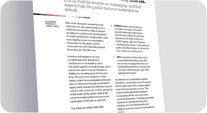 As supply chain standards Trend improve, sustainability claims will become the norm. Brands must be smarter on messaging—and find ways to help the public become sustainable by default. By GEMMA Back when dinosaurs roamed the earth • COP26 leaders asked nations to BARDSLEY, a decade or so ago, greenwashing was a consider, formulate, and publish JAMIE HAMILL viable business practice. Slap an earnest updated Nationally Determined sounding but ambiguously worded decal Contributions (NDCs) to the Paris on a label, and brands could plausibly claim Agreement for 2030 by the time to be keeping an eye on sustainability. COP27 begins next year. This new Fortunately for the planet, and for “ratcheting mechanism” will enable the consumers who don’t like being duped, public and other nations to call out the those days are officially over. slow movers on climate action. Investors and regulators are now • 92% of people say they want to live scrutinizing brands’ threshold of a sustainable lifestyle, but only 16% compliance to sustainability claims. are actively changing their behaviors. The palace guard is no longer asleep, which Sustainable experiences can also help means that claims must be verifiable in solve this intention/action gap while addition to sounding good. At the same helping brands grow. time, the sunk costs required to make supply chains more sustainable will be less As attention on sustainability matters easy to claim back through sustainability intensifies, conversation around business equity alone. Brands must find new ways to efforts will morph from a unique selling connect with customers on their sensitivity proposition to business as usual. That to the health of the planet, while at the means brands will need to integrate 6same time helping them become more sustainability efforts into their entire sustainable in their day-to-day lives. customer experience. Creating sustainable experiences will help brands adopt The stakes are indisputably high: solutions into the full brand lifecycle, helping customers become sustainable by • 74% of global institutional investors default. revise investments if a company does not consider environmental, social, and governance (ESG) criteria within their business model. 25 BUSINESS & GROWTH TRENDS 2022 OGILVY GROWTH & INNOVATION