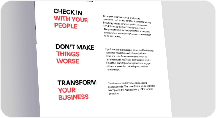 WhatTO DO NEXT CHECK IN The supply chain is made up of ships and WITH YOUR containers—but it’s also a system that relies on living, breathing humans to work together. Companies PEOPLE should listen to their workforce and support it. The pandemic has evolved rather than ended, and emergency operating conditions were never meant to be permanent. DON’T MAKE If you’re experiencing supply issues, avoid enhancing THINGS consumer frustrations with delayed delivery times and out-of-stock messaging simply to WORSE remain relevant. You’ll only destroy brand loyalty. Find other ways to promote growth and engage with consumers that maintain your customer relationships. TRANSFORM Consider a more distributed and localized YOUR business model. The more diverse your commerce touchpoints, the more resilient you’ll be to future BUSINESS disruption. BUSINESS & GROWTH TRENDS 2022 OGILVY GROWTH & INNOVATION