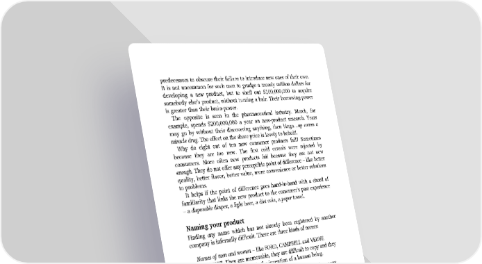predecessors to obscure their failure to introduce new ones of their own. It is not uncommon for such men to grudge a measly million dollars for developing a new product, but to shell out $100,000,000 to acquire somebody else’s product, without turning a hair. Their borrowing-power is greater than their brain-power. The opposite is seen in the pharmaceutical industry. Merck, for example, spends $200,000,000 a year on new-product research. Years may go by without their discovering anything, then bingo…up comes a miracle drug. The effect on the share price is lovely to behold. Why do eight out of ten new consumer products fail? Sometimes because they are too new. The first cold cereals were rejected by consumers. More often new products fail because they are not new enough. They do not offer any perceptible point of difference – like better quality, better flavor, better value, more convenience or better solutions to problems. It helps if the point of difference goes hand-in-hand with a chord of familiarity that links the new product to the consumer’s past experience – a disposable diaper, a light beer, a diet cola, a paper towel. Naming your product Finding any name which has not already been registered by another company is infernally difficult. There are three kinds of names: Names of men and women – like FORD, CAMPBELL and VEUVE CLICQUOT. They are memorable, they are difficult to copy and they suggest that your product is the invention of a human being. Meaningless names like KODAK, KOTEX, and CAMEL. It takes many years and millions of dollars to endow them with any sales appeal. Descriptive names like 3-IN-ONE OIL, BAND-AID and JANITOR IN A DRUM. Such names start with sales appeal. But they are too specific to be used for subsequent line-extensions. You can use consumer research to find out whether a name says what you think it says, whether it is easily pronounceable, whether it is confused with existing names, and whether it is memorable.