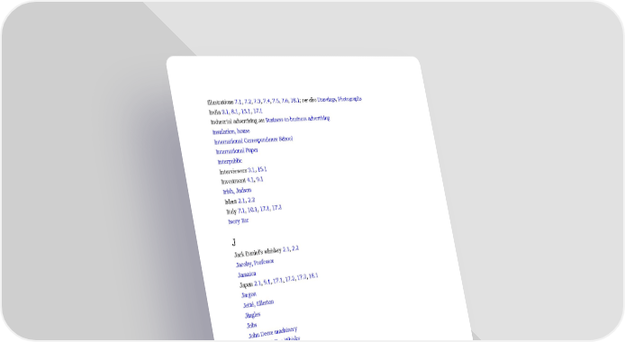 Illustrations 7.1, 7.2, 7.3, 7.4, 7.5, 7.6, 18.1; see also Drawings, Photographs India 3.1, 8.1, 13.1, 17.1 Industrial advertising see Business-to-business advertising Insulation, house International Correspondence School International Paper Interpublic Interviewers 3.1, 15.1 Investment 4.1, 9.1 Irish, Judson Islam 2.1, 2.2 Italy 7.1, 10.1, 17.1, 17.2 Ivory Bar J Jack Daniel’s whiskey 2.1, 2.2 Jacoby, Professor Jamaica Japan 2.1, 9.1, 17.1, 17.2, 17.3, 18.1 Jargon Jetté, Ellerton Jingles Jobs John Deere machinery Johnny Walker Whisky Johnson, Arno Johnson, Howard Johnson, Lyndon 18.1, 19.1, 19.2, 19.3 Johnson, Samuel Jones agency J. Walter Thompson 2.1, 5.1, 5.2, 12.1, 18.1, 18.2, 18.3 K Kelstadt, Charlie 6.1, 9.1 Kennedy, John E. Kennedy, John F. 4.1, 8.1