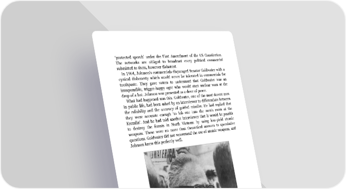 ‘protected speech’ under the First Amendment of the US Constitution. The networks are obliged to broadcast every political commercial submitted to them, however dishonest. In 1964, Johnson’s commercials disparaged Senator Goldwater with a cynical dishonesty which would never be tolerated in commercials for toothpaste. They gave voters to understand that Goldwater was an irresponsible, trigger-happy ogre who would start nuclear wars at the drop of a hat. Johnson was presented as a dove of peace. What had happened was this. Goldwater, one of the most decent men in public life, had been asked by an interviewer to differentiate between the reliability and the accuracy of guided missiles. He had replied that they were accurate enough ‘to lob one into the men’s room at the Kremlin’. And he had told another interviewer that it would be possible to destroy the forests in North Vietnam by using low-yield atomic weapons. These were no more than theoretical answers to speculative questions. Goldwater did not recommend the use of atomic weapons, and Johnson knew this perfectly well. In 1964, Barry Goldwater’s presidential campaign was effectively scuppered by unscrupulous commercials put out by his opponent, Lyndon Johnson.