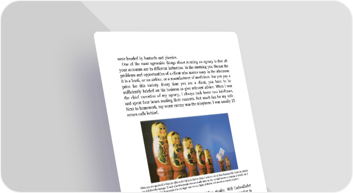 were headed by bastards and phonies. One of the most agreeable things about running an agency is that all your accounts are in different industries. In the morning you discuss the problems and opportunities of a client who makes soap. In the afternoon it is a bank, or an airline, or a manufacturer of medicines. But you pay a price for this variety. Every time you see a client, you have to be sufficiently briefed on his business to give relevant advice. When I was the chief executive of my agency, I always took home two briefcases, and spent four hours reading their contents. Not much fun for my wife. Next to homework, my worst enemy was the telephone. I was usually 25 return calls behind. When you are appointed to head an office in the Ogilvy & Mather chain, I send you one of these Russian dolls. Inside the smallest you will find this message: ‘If each of us hires people who are smaller than we are, we shall become a company of dwarfs, but if each of us hires people who are bigger than we are, Ogilvy & Mather will become a company of giants.’ Agencies are breeding-grounds for sibling rivalry. Will Cadwallader get a corner office before Balfour? Why did you invite Pennypacker to lunch instead of Morgan? Why was Sidebottom made a Vice-President before Winterbottom? The agency I know best has two Chairmen, three Presidents, two Managing Directors, eight Executive Vice-Presidents, 67 Senior Vice-Presidents and 249 Vice-Presidents. You might suppose that nobody would take such nonsense seriously, but they do. Giving out the titles reminds me of Louis XIV: ‘Every time I give someone a title, I make a hundred people angry and one person ungrateful.’ What can you do to keep sibling rivalry under control? You can be fair, and you can avoid playing favorites. Said Dr. William Menninger: