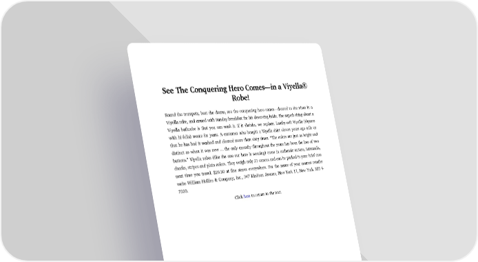 See The Conquering Hero Comes—in a Viyella® Robe! Sound the trumpets, beat the drums, see the conquering hero comes—dressed to the nines in a Viyella robe, and armed with Sunday breakfast for his deserving bride. The superb thing about a Viyella bathrobe is that you can wash it. If it shrinks, we replace. Lamby-soft Viyella (rhymes with hi-fella) wears for years. A customer who bought a Viyella shirt eleven years ago tells us that he has had it washed and cleaned more than sixty times. “The colors are just as bright and distinct as when it was new … the only casualty throughout the years has been the loss of two buttons.” Viyella robes (like the one our hero is wearing) come in authentic tartans, tattersalls, checks, stripes and plain colors. They weigh only 21 ounces and can be packed in your brief case next time you travel. $28.50 at fine stores everywhere. For the name of your nearest retailer write William Hollins & Company, Inc., 347 Madison Avenue, New York 17, New York. MU 4- 7330. Click here to return to the text.