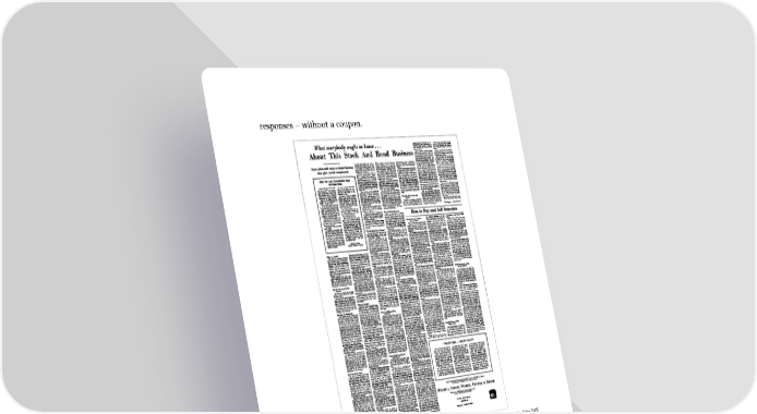 responses – without a coupon. This advertisement contains 6,540 words – the most anybody has ever used in a single page. When it appeared in the New York Times, it pulled 10,000 responses to an offer of a booklet buried near the end. It was written by the late Louis Engel of Merrill Lynch. Click here for hi-res image.